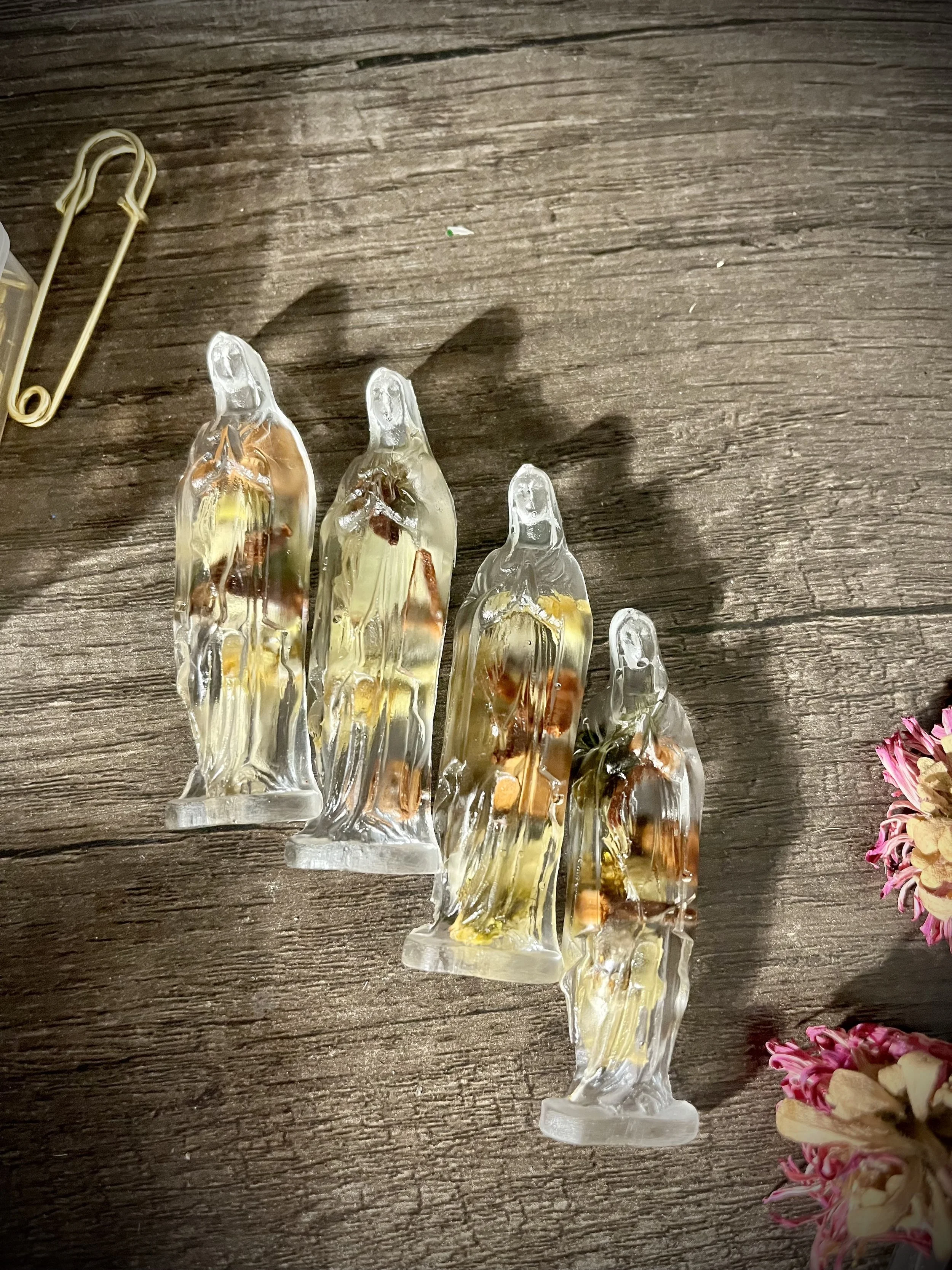 Inspired by the golden days of summer, these Marian charms and statues were made to bring the feeling of abundance to your home or altar. Each one is a little different and handmade by me with intuitive magical inclusions like sunflower seeds, yellow roses, sunflower petals, silk roses, black-eyed peas, green leaves, honey, and gold flakes.
